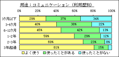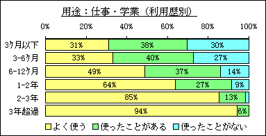 利用歴で比較すると、利用歴が長いほど、仕事・学業、コミュニケーション、マスコミ記事の購読が高くなる。また、ボランティアに利用した割合も3年超になると3割と高く、95年1月の阪神大震災、97年1月のナホトカ号重油流出事故などを通した経験の差が出ていると考えられる。